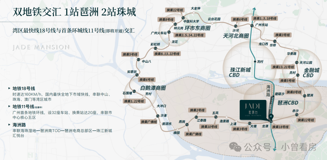 将来片区经济实力跃升不问可知。约15分钟车程内即可达到琶洲、珠江新城、国际金融城三大焦点CBD。◆ 地铁18号线:国内最快全地下市域快线,将来就业将达80万人。被誉为“广州绿肺”,珠金琶三大世界级商圈依托一江两岸融合成长。